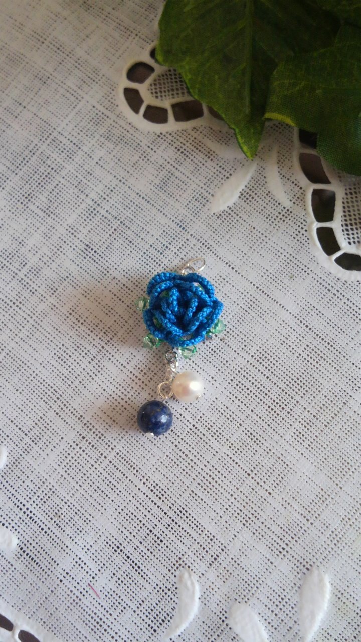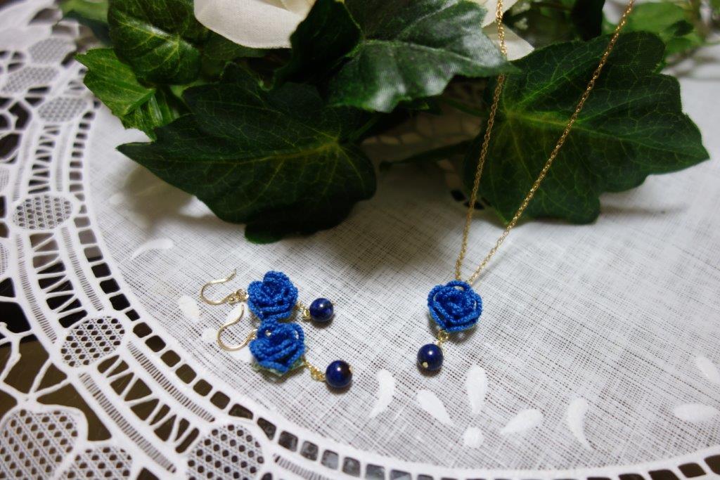 例2:ピアス用ローズパーツ(ローズの糸は宇宙(そら)色、葉の糸はエメラルドグリーン)