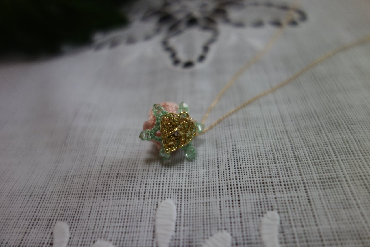 手編み タティングレース ピンク・ローズ(ダルマ糸) ネックレス